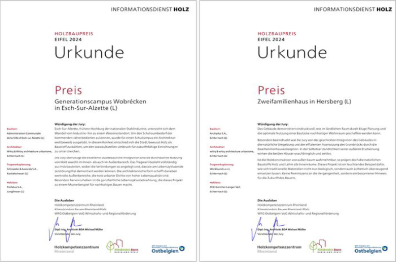 Witry & Witry wurden mit zwei Auszeichnungen geehrt. Ein Preis ging an den Generationencampus Wobrécken in Esch-sur-Alzette, ein weiterer Preis wurde für die Plusenergie-Wohnhäuser in Hersberg verliehen.