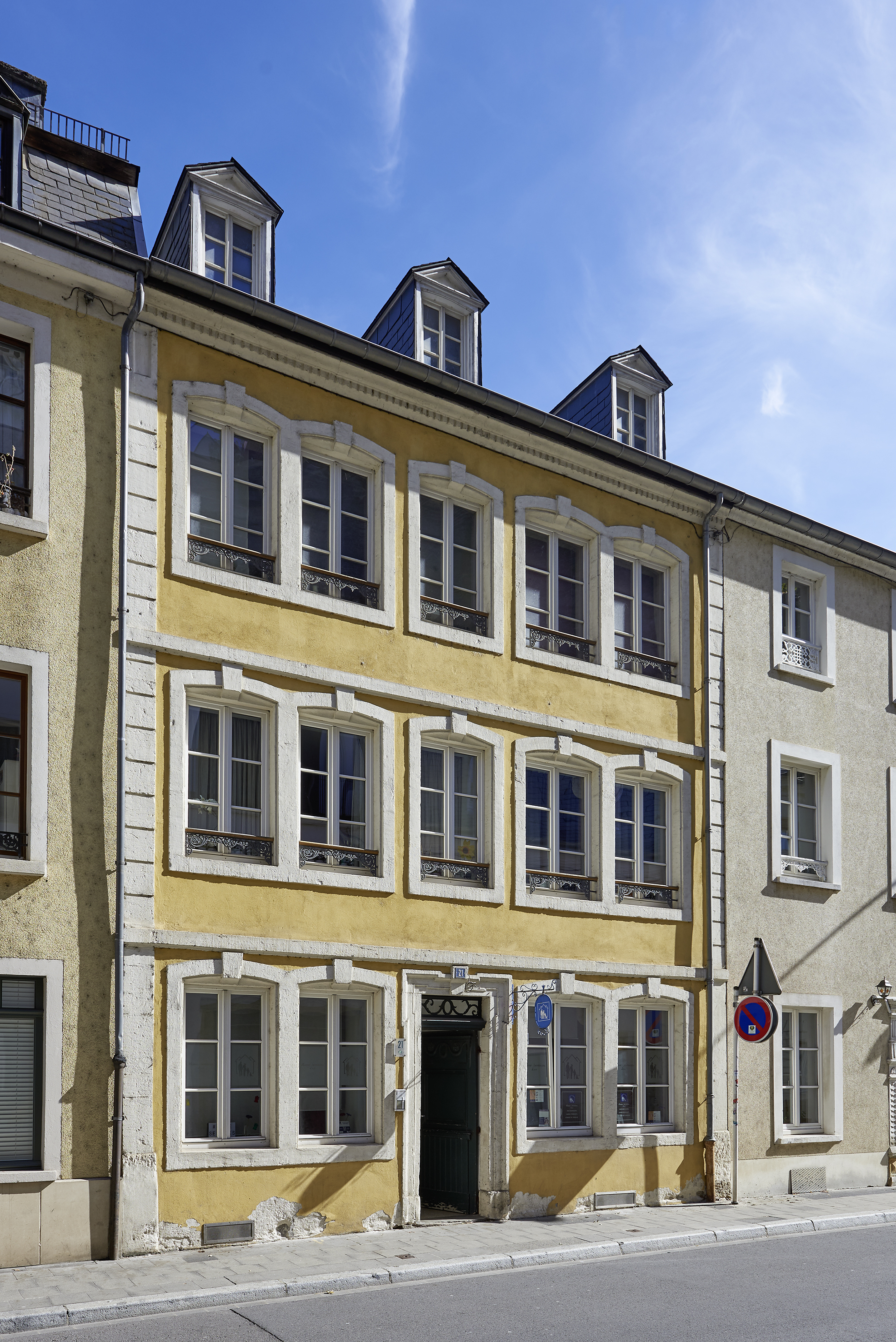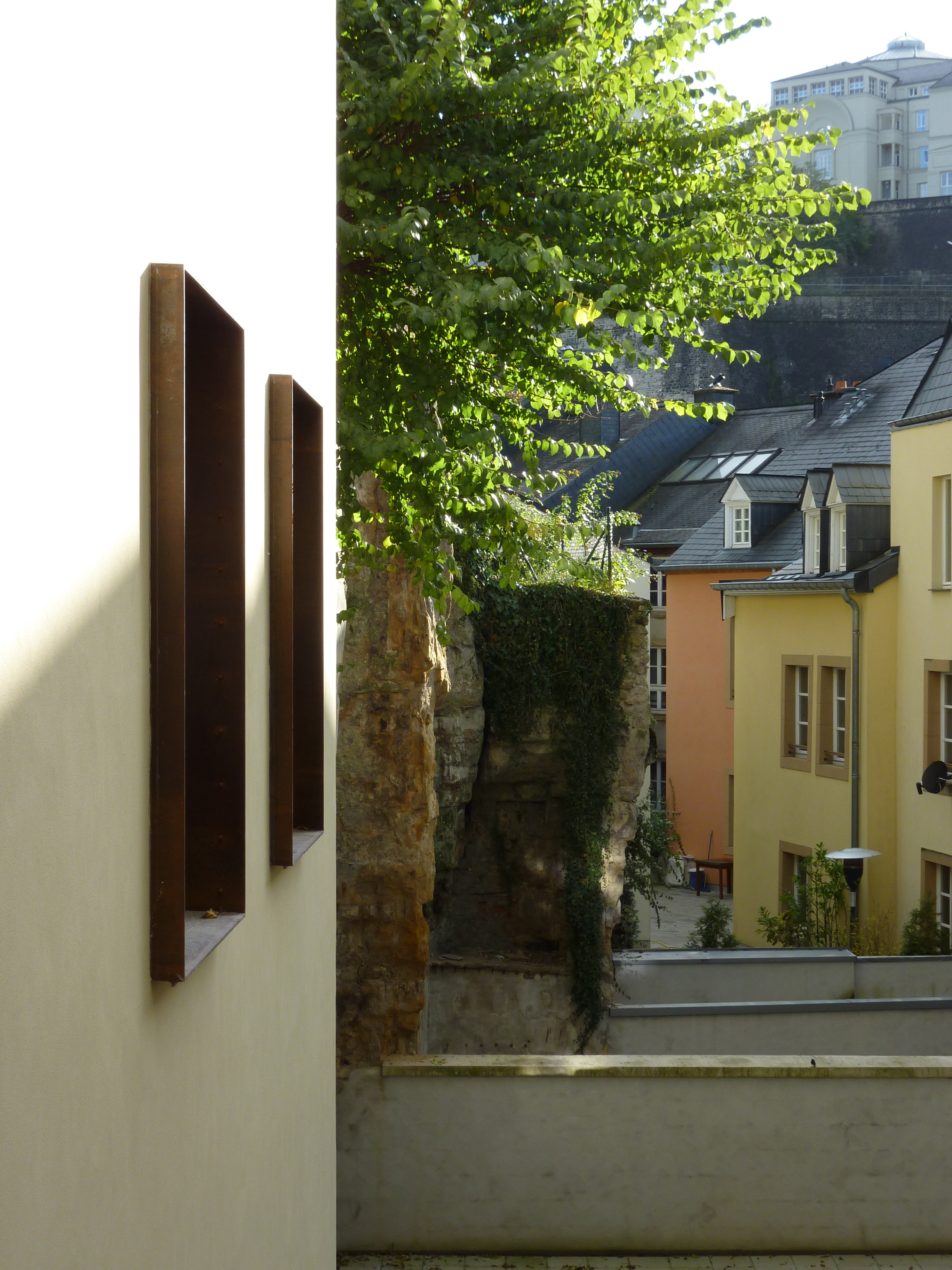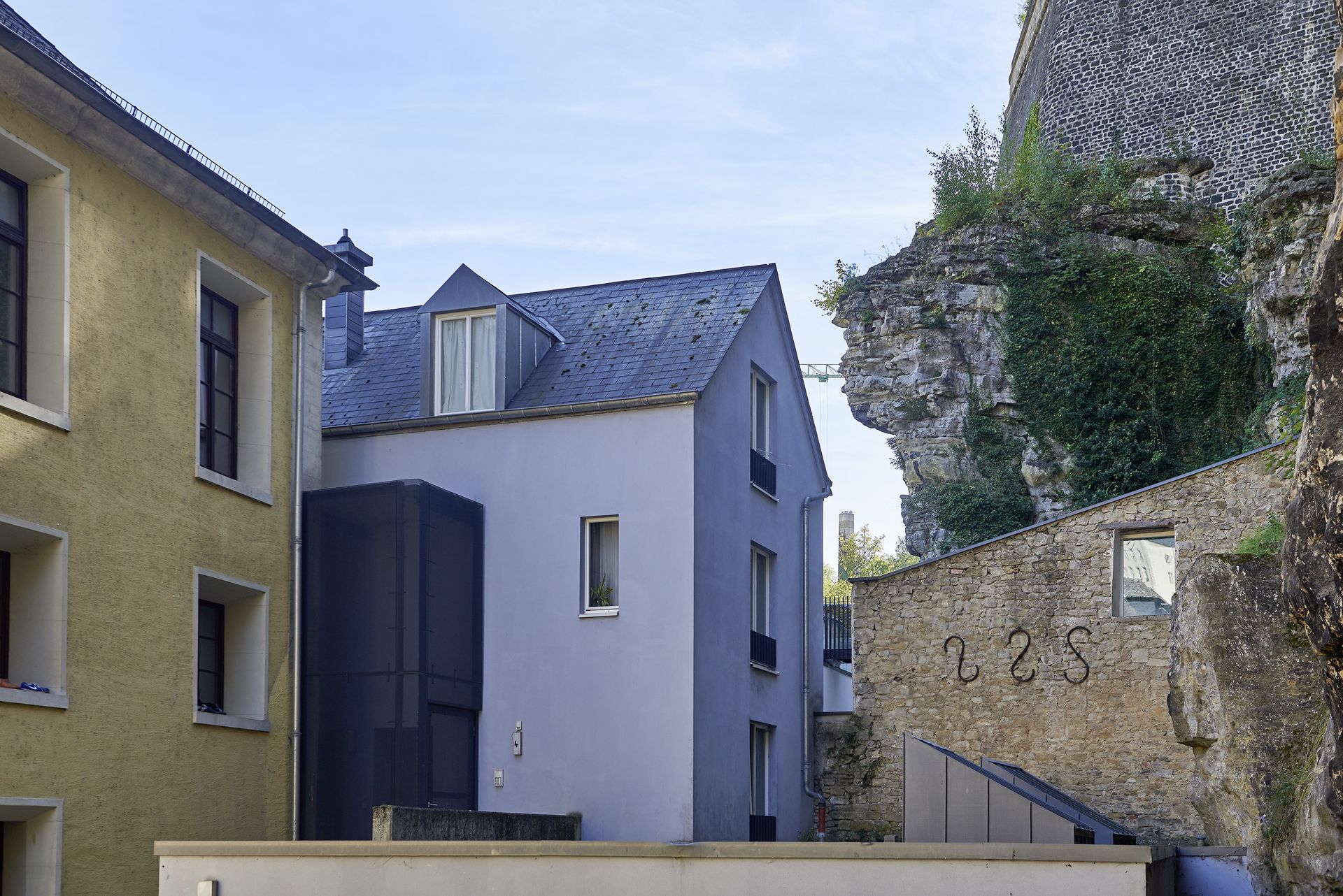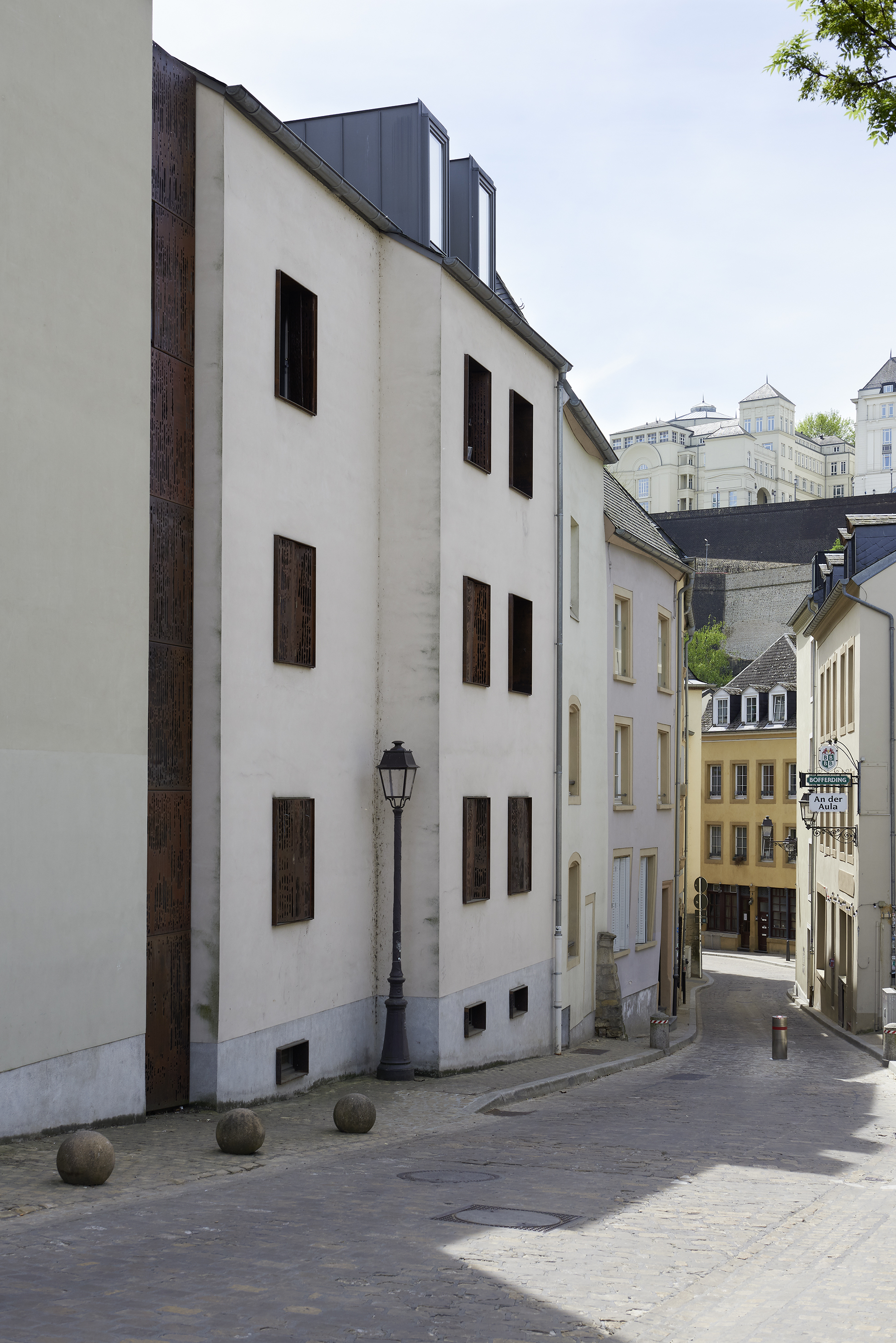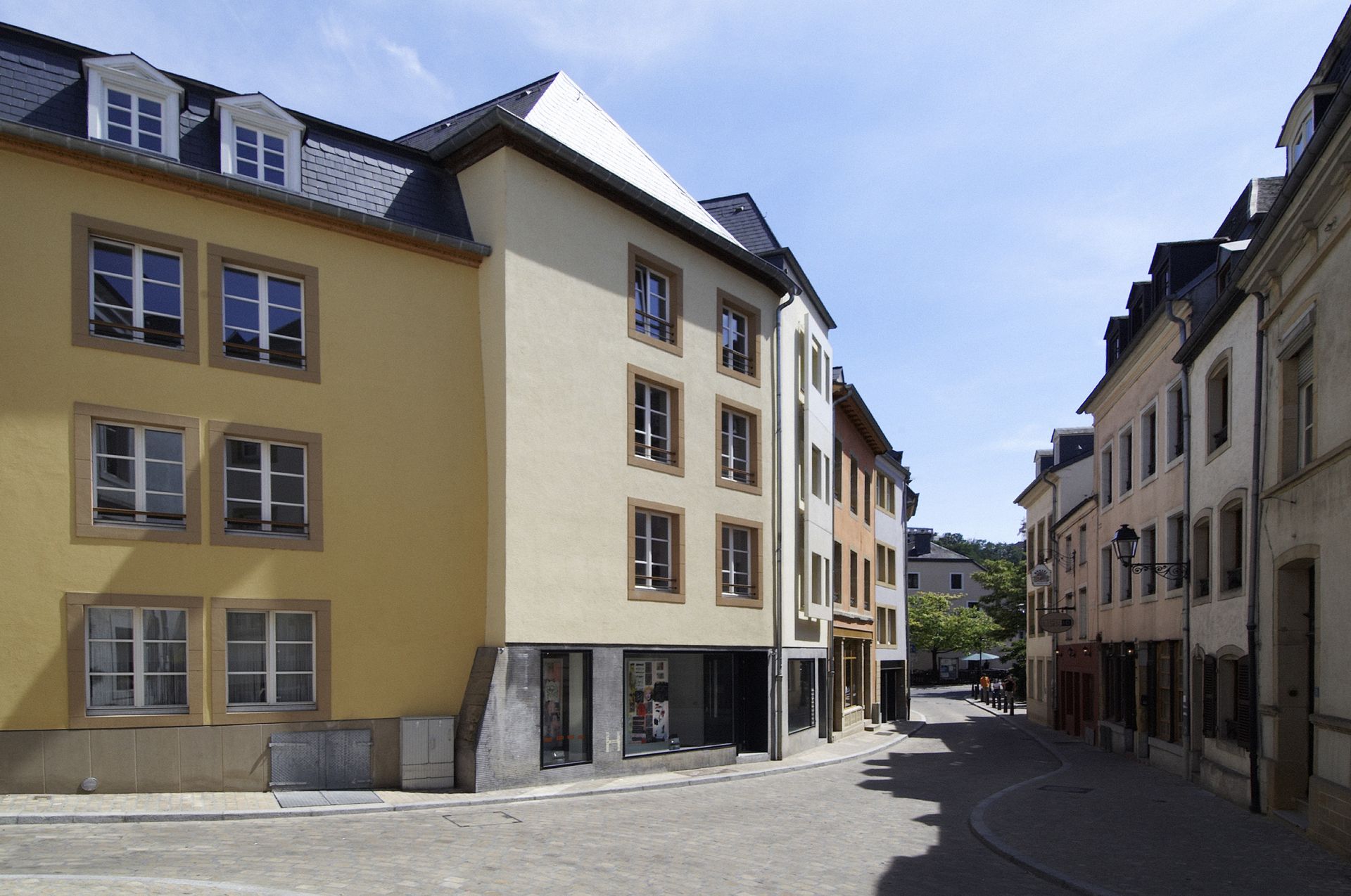 Die historische Altstadt Luxemburgs mit ihren historischen Stadtvierteln wurde 1994 zum Unesco-Weltkulturerbe erklärt. Der 1802 vom Ingenieur Boitard erstellte Reliefplan gibt einen guten Eindruck vom Erscheinungsbild der Stadt im Jahr 1800 mit Details zu den für die Zeit charakteristischen Fassaden und Volumina. Inspiriert von diesen Zeichnungen war es das Ziel, die Atmosphäre und den Charakter dieser traditionellen Physiognomie, die immer die vorherrschende Parzellenstruktur der Altstadt geblieben ist, in die Überlegungen der Sanierung einfließen zu lassen. Es ging dabei nicht darum, einfach zu kopieren, sondern durch eine Neuinterpretation eine städtische Reparatur des Stadtgefüges durchzuführen. Die schmale Parzellierung sollte in der Teilung der Fassaden wieder lesbar gemacht und die Gebäudevolumen bei Bedarf neu konzipiert und erweitert werden.