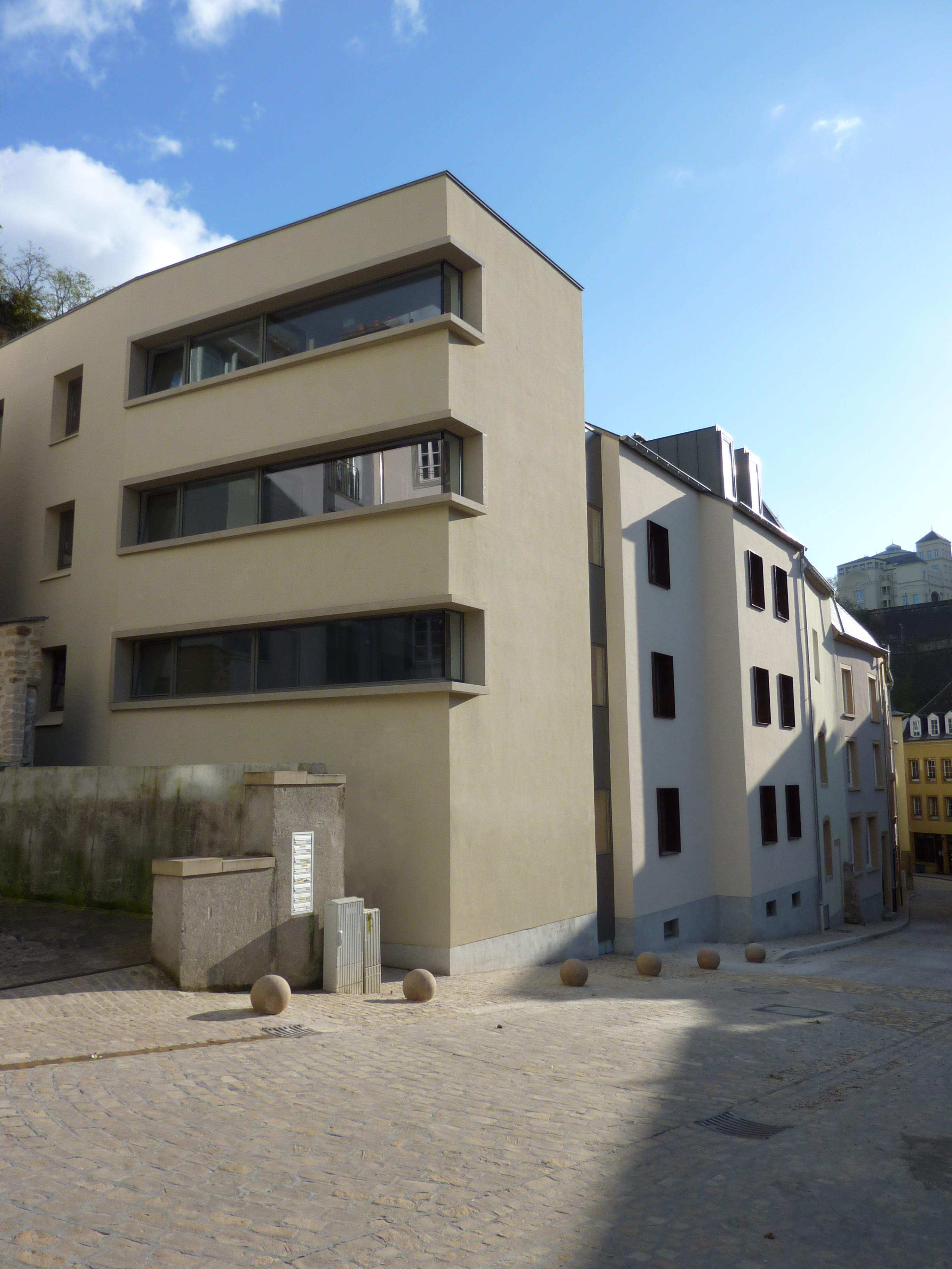 Lediglich die Häuser 14-16 Rue de Trèves mussten aufgrund ihrer baulichen Substanz durch Neubauten ersetzt werden. An dieser Stelle entstand für die Stadt Luxemburg ein neues Gebäude mit insgesamt 17 Studentenappartments. Auch hier wurde in der Architektur ein besonderes Augenmerk auf die klare Erkennbarkeit von bestehenden und neuen Gebäuden und eine gute Eingliederung in die gewachsene Stadtstruktur gelegt. Die Fassade ist daher ablesbar neu, orientiert sich aber in ihrer Aufgliederung und Höhe am Bestand und schafft dadurch ein insgesamt stimmiges Stadtbild. Das einfache Volumen mit begrüntem Flachdach kontrastiert mit den giebelständigen Häusern im Grund, fügt sich aber gleichzeitig mit seinem sandsteinfarbigen mineralischen Fassadenputz, der sich an die umliegenden Felsvorsprünge anlehnt, harmonisch in das Gesamtensemble des Grunds ein.