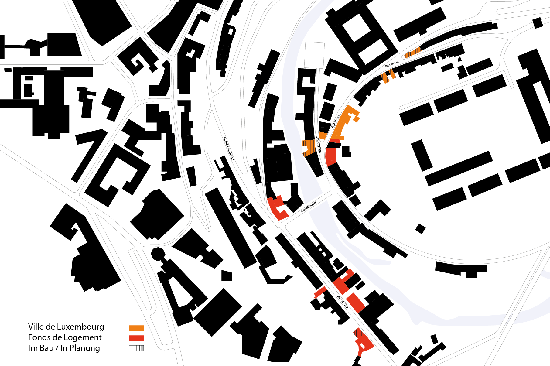 In diesem Sinne wurden in der historischen Unterstadt Luxembourg-Grund in verschiedenen Bauphasen mehrere Gebäude umgebaut und saniert. Da das Viertel Grund eingeengt zwischen den massigen Felsen und den Ufern der Petrusse und Alzette wegen der Überschwemmungsgefahr ein typischer Armenvorort war, wurde die Philosophie verfolgt auch zukünftig einen Teil der dort typischen Bevölkerungsgruppe zu erhalten. Daher wurden einige Gebäude im Auftrag vom "Fonds pour le Logement à coût modéré" für Soziales Wohnen umgebaut.