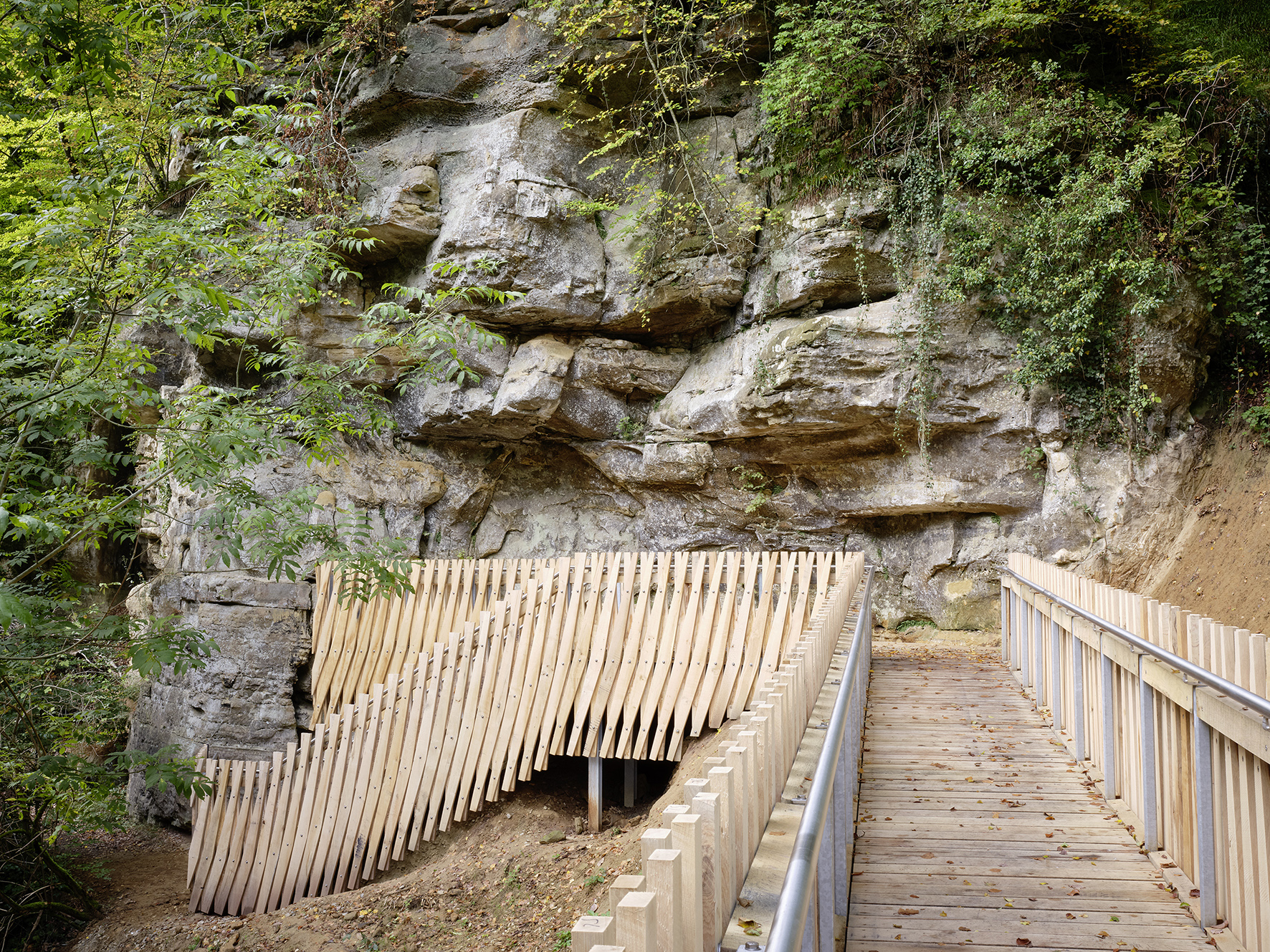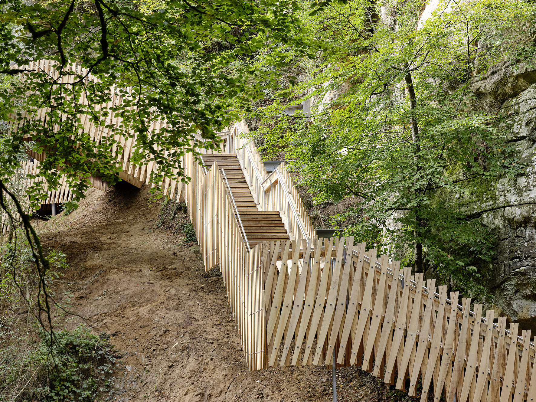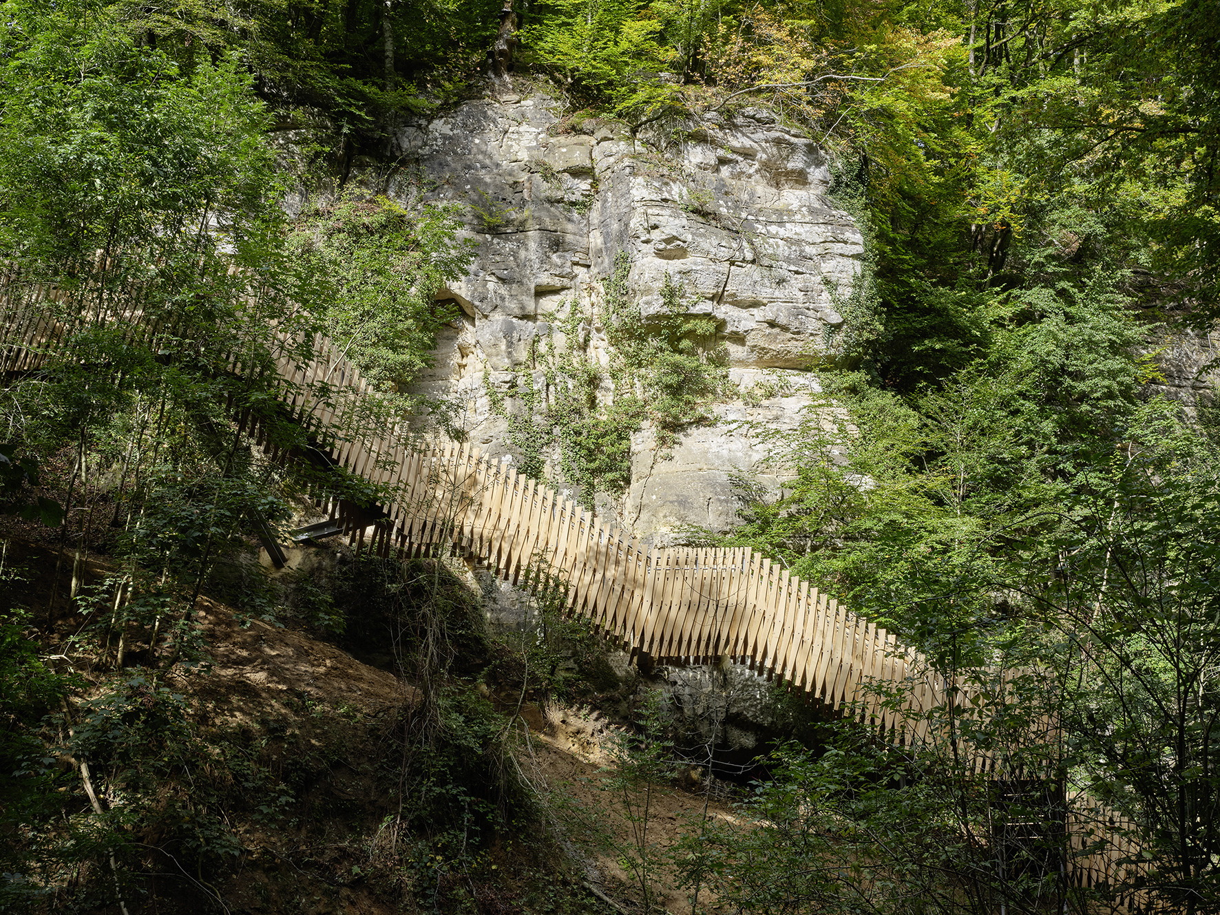 Nach schweren Unwettern im Juni 2018 wurde die „kleine Luxemburger Schweiz“ - touristisches Herzstück Luxemburgs mit starken Schäden an Straßen und Wanderwegen konfrontiert. In unmittelbarer Nähe des Schießentümpels – eines Wahrzeichens des Müllerthals – war ein großes Teilstück eines viel benutzten Wanderwegs abgerutscht und somit nicht mehr nutzbar. Da der Hang noch weiter in Bewegung ist, musste eine Lösung gefunden werden, die vom Hang losgelöst bestehen bleibt. Die neue Konstruktion, die sich in einer Natura 2000-Zone und in einem Quellenschutzgebiet befindet, wurde als Stahlkonstruktion direkt in die Felsen verankert, so dass weitere Hangbewegungen die Treppe nicht berühren. Die Treppenanlage mit einer Gesamtlänge von 89 Metern überwindet mit 114 Treppenstufen rund 16 Höhenmeter und kragt mit einer Passerelle über 17,4 Meter aus.