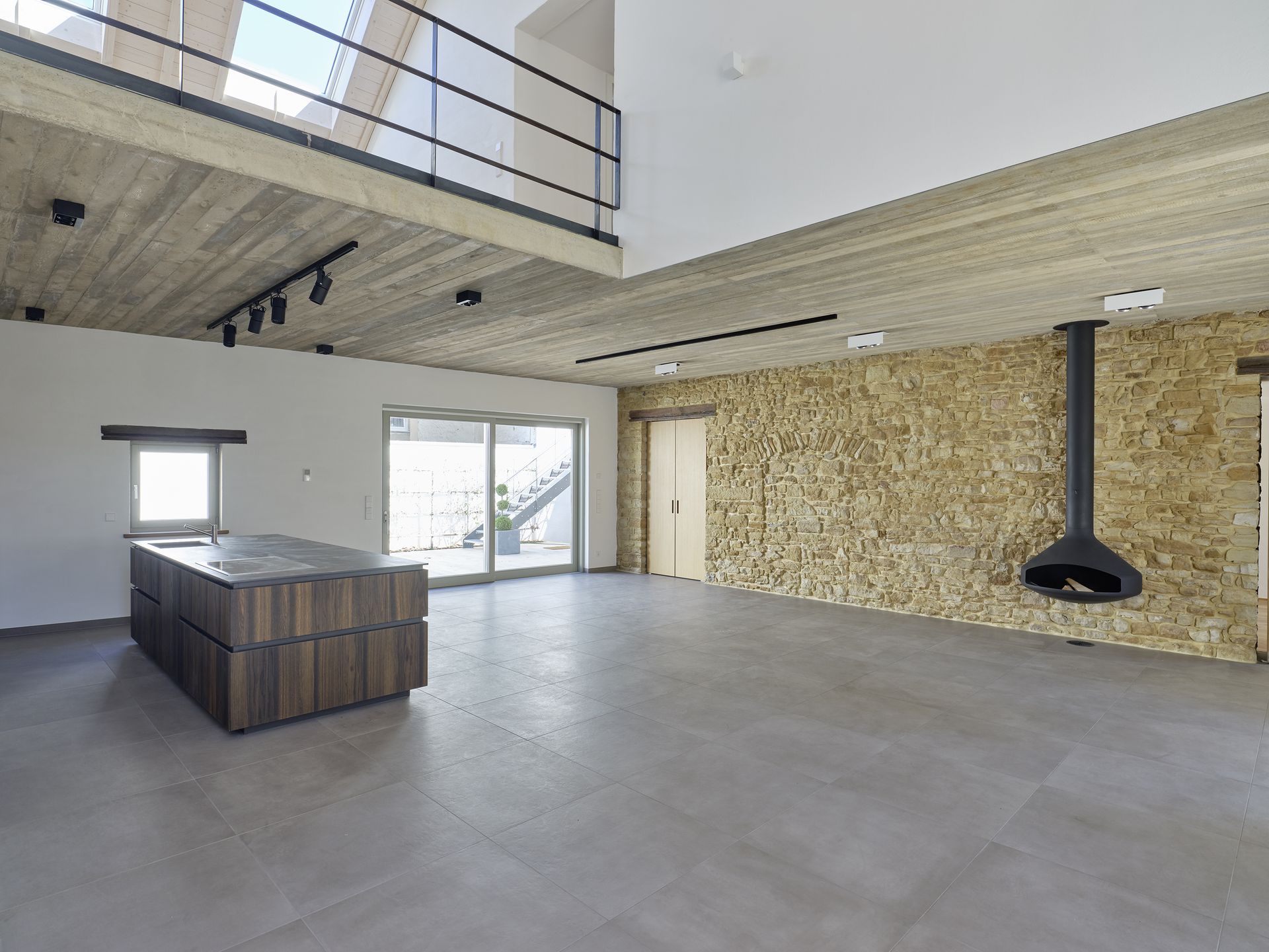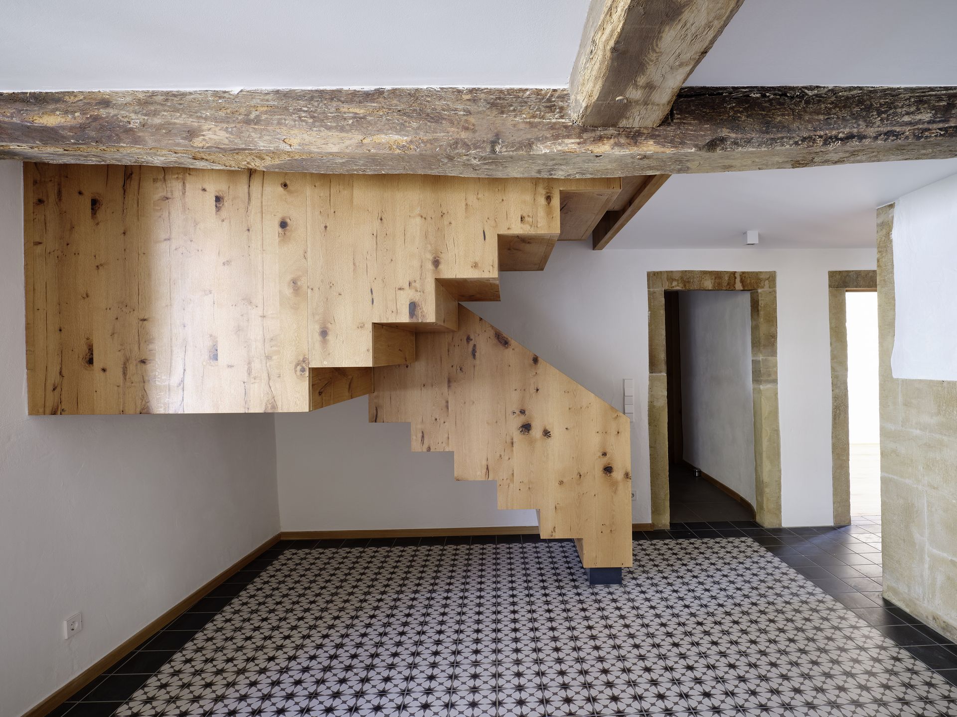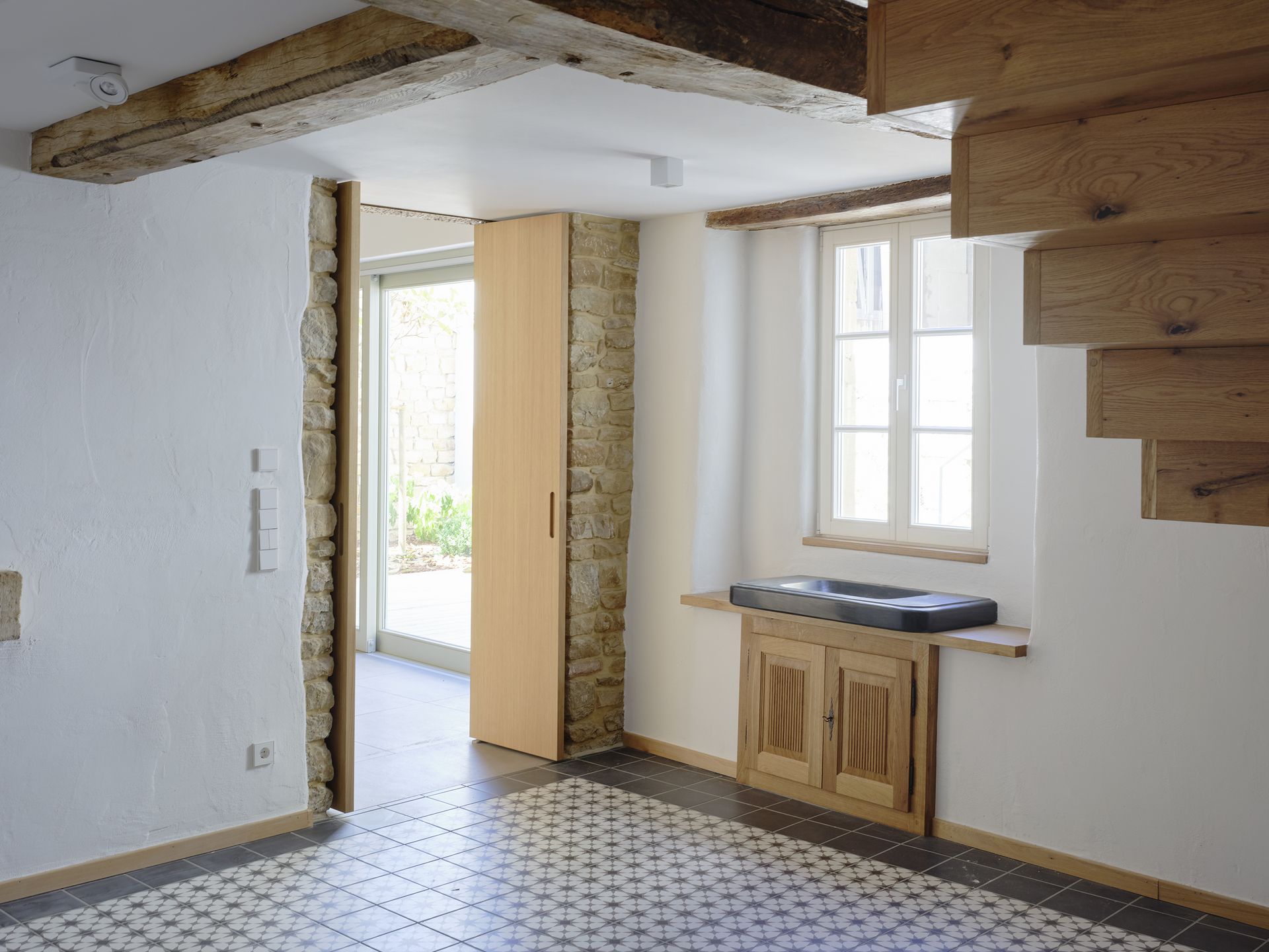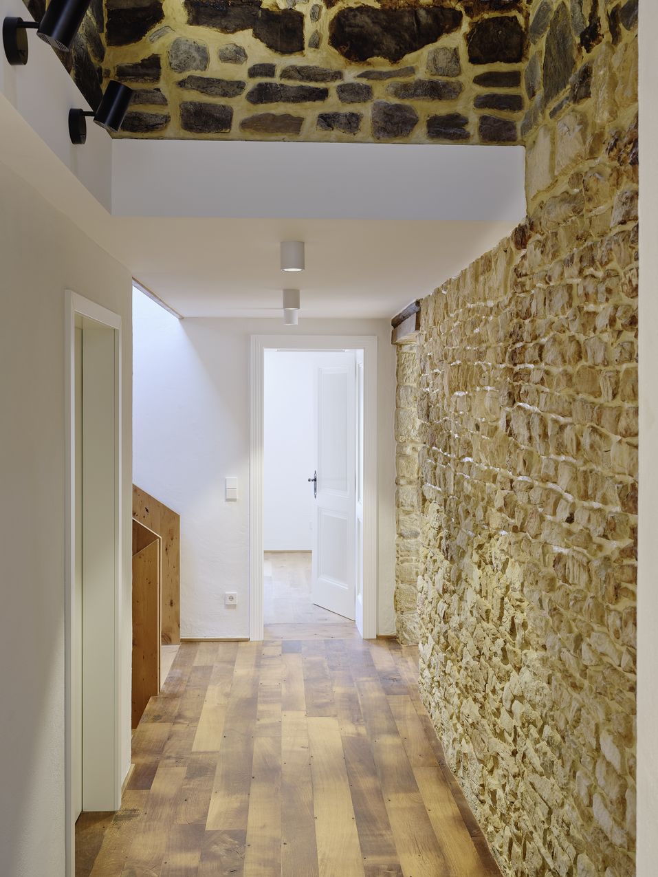 Im Inneren wurde das Wohnhaus wurde bis auf die Tragwände und die zu erhaltende „Haascht“ entkernt und saniert. Die „Haascht“ im Gebäude wurde saniert und bleibt als Blickfang durch eine im Boden eingelassene begehbare Glasscheibe von unten einsehbar. Die Holzdielenböden im 1.OG des Wohnhauses wurden aufgenommen und soweit möglich überarbeitet und neu verlegt. Auch die historischen Türen wurden nach Möglichkeit erhalten und wieder eingebaut. Die Scheune wurde ebenfalls entkernt und im Innenraum komplett neu strukturiert. Hier entststand ein großzügiger, über die gesamte Höhe offener Wohn-Essbereich mit Mezzanine. Die Fenster in der Scheune wurden bewusst in Moderner Formensprache, die sich jedoch harmonisch in den historischen Gesamtkontext einfügt, ausgeführt.