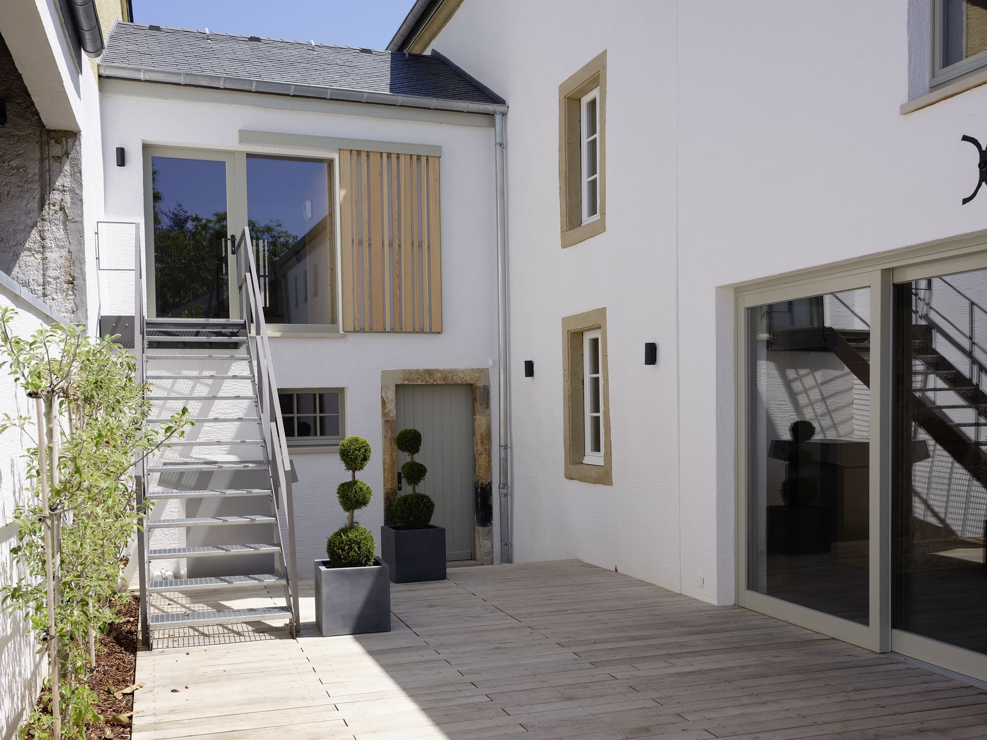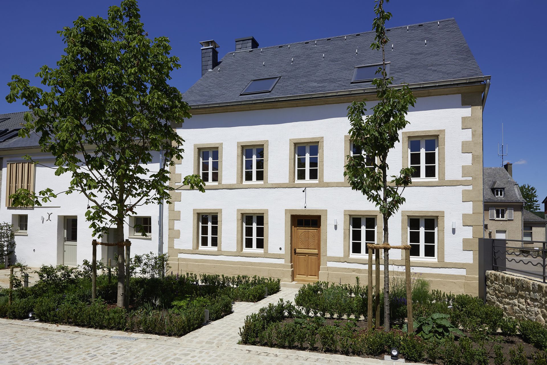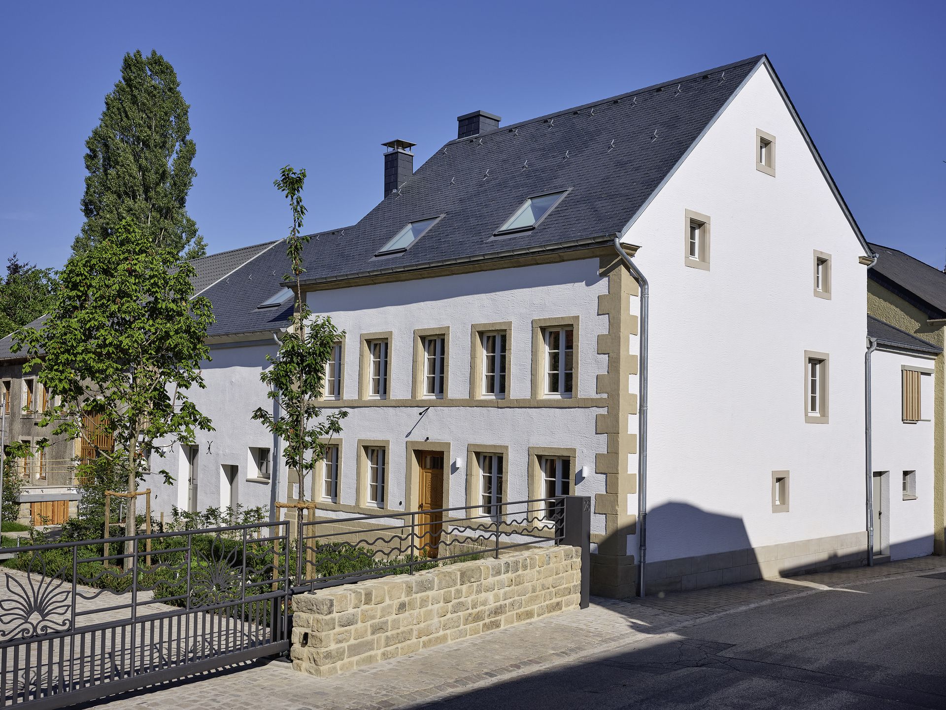 In Consdorf wurde ein historischer, ortsbildender Streckhof aus der Mitte des 19. Jahrhunderts renoviert und zu einem Wohngebäude umgebaut. Das denkmalgeschützte Anwesen bestand aus einem Wohnhaus mit nebenliegender Scheune und einem seitlichen angebautem Schuppen zur Straße. In enger Absprache mit SSMN wurde der komplette Gebäudekomplex saniert und unter Beibehaltung einiger für die Entstehungszeit wesentlichen typischen Gestaltungselemente zu einem großzügigen Wohnhaus umgebaut. Das Wohnhaus und die Scheune wurden in ihrem äußeren Erscheinungsbild erhalten. Die Dächer wurden komplett erneuert und mit einer Schieferschablonendeckung neu eingedeckt, der Außenputz und die Fenster nach historischem Vorbild erneuert.