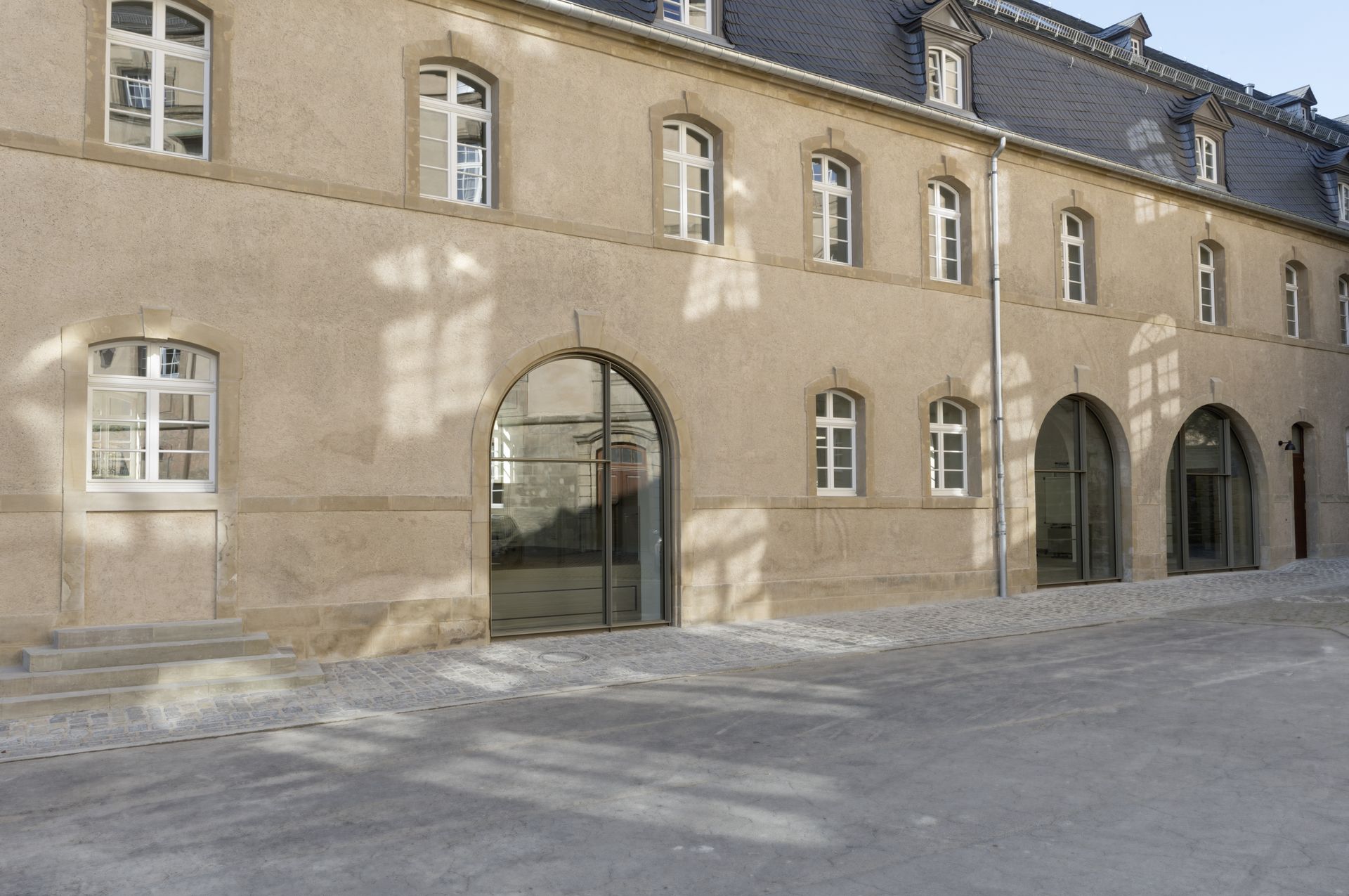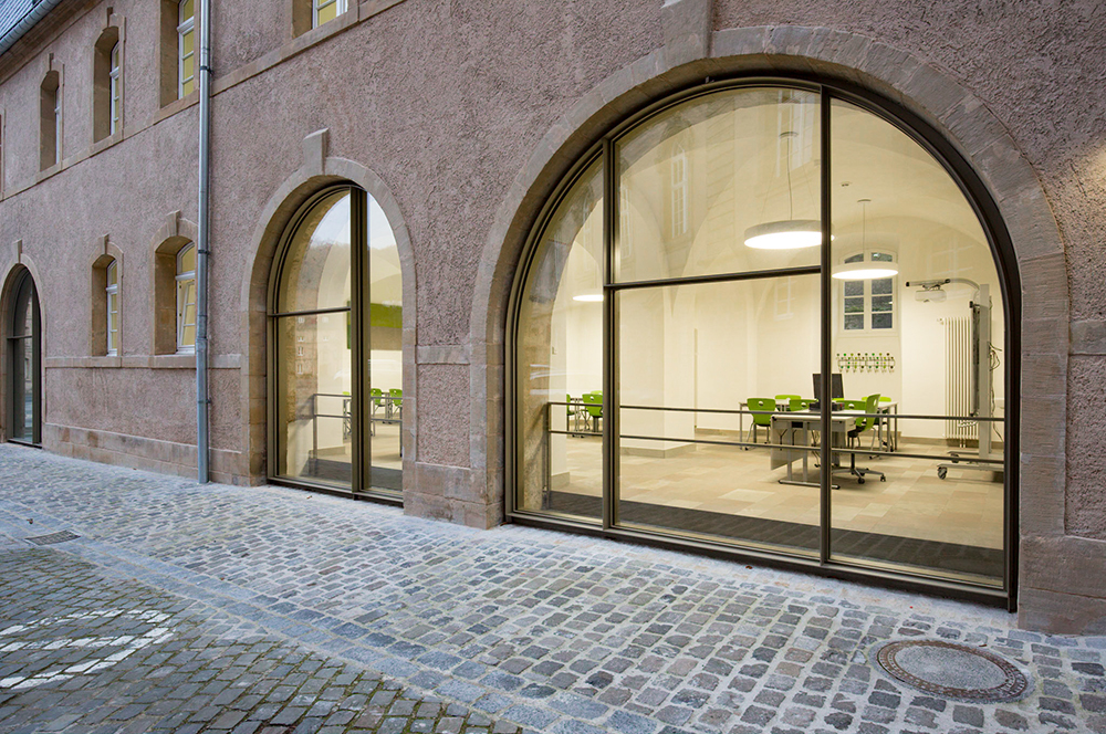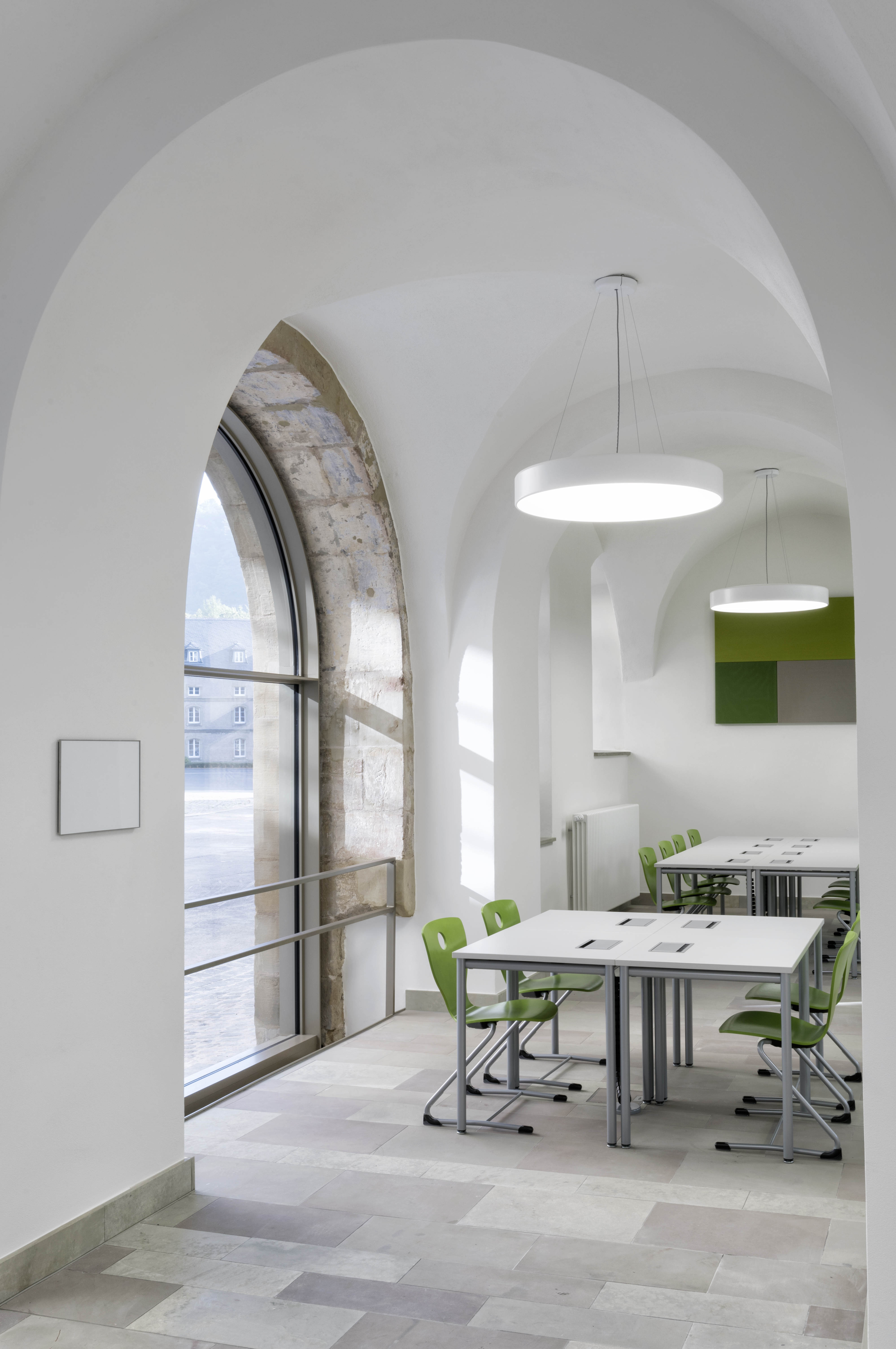 Im staatlichen Gymnasium, dem spätbarocken Gebäudekomplex der ehemaligen Echternacher Abtei, wurde der Flügel „Aile Gendarmerie“, der bis dahin mit Büros und Wohnungen der Gendarmerie belegt war, für den Schulbetrieb umgebaut. In diesem 90m langen Gebäudeflügel entlang der Rue du Pont wurden 13 Klassenräume mit Nebenräumen für Kunst-, Sprach- und naturwissenschaftlichen Unterricht sowie Büros und Räumlichkeiten für die Schulmedizin untergebracht. Die Volumetrie und die Außenwände des Gebäudes wurden erhalten, so dass das äußere Erscheinungsbild des Flügels sich in den Gesamtkomplex der ehemaligen Klosteranlage einfügt. Der Innenbereich wurde komplett entkernt um mit einer neuen Strukturierung eine optimale Funktionalität für die geforderten Flächen zu erreichen. Durch die schmale Breite des Gebäudeflügels nehmen die Klassensäle die gesamte Gebäudebreite ein, werden dadurch von zwei oder drei Seiten natürlich belichtet und erhalten eine helle und freundliche Atmosphäre. Auch ein durchgängiges Farbkonzept, das sich in den Klassenräumen wie auch in den Treppenhäusern findet, unterstreicht die einladende Aufenthaltsqualität.